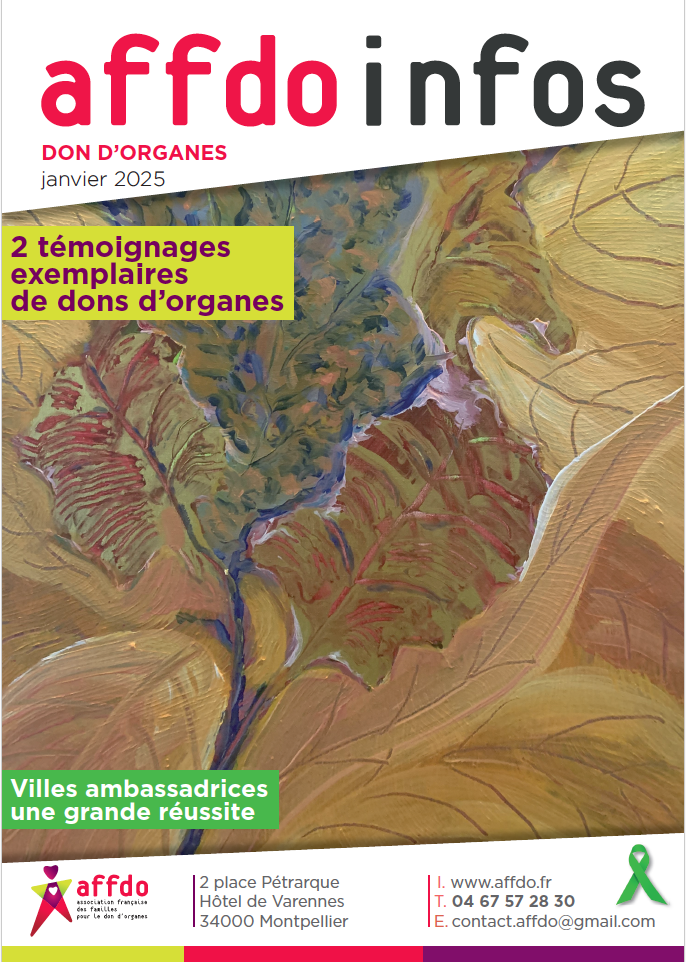 Témoignages de donneurs, de greffés : un parcours difficile, leurs épreuves, la vie retrouvée grâce à la science, à la greffe réussie et à un soutien essentiel de l’AFFDO « Association Française des Familles pour le Don d’Organes ».